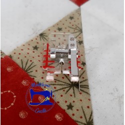 2. Il piedino trasparente per quilt con guida laterale è dotato di tacche rosse. Le tacche ti aiutano ad allineare il tessuto all’inizio della cucitura, negli angoli e sui bordi.