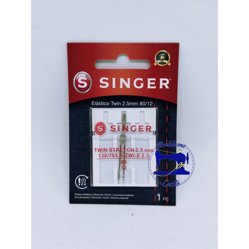 Distanza tra i due aghi 2.5 mm, misura NM 80, per tessuti elastici. Crea due file di punti contemporaneamente in tessuti elasticizzati grazie alla punta arrotondata che permatte di perforare i tessuti più spessi.