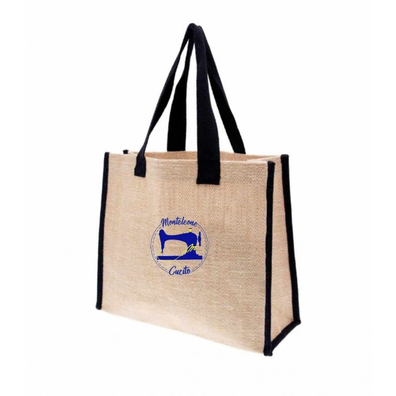 Borsa in Juta con rifiniture nero personalizzabile con frange, pom pom, nastri disponibili nelle relative categorie.