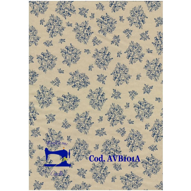 Tessuto beige con fiorellini blu. 100% cotone.
