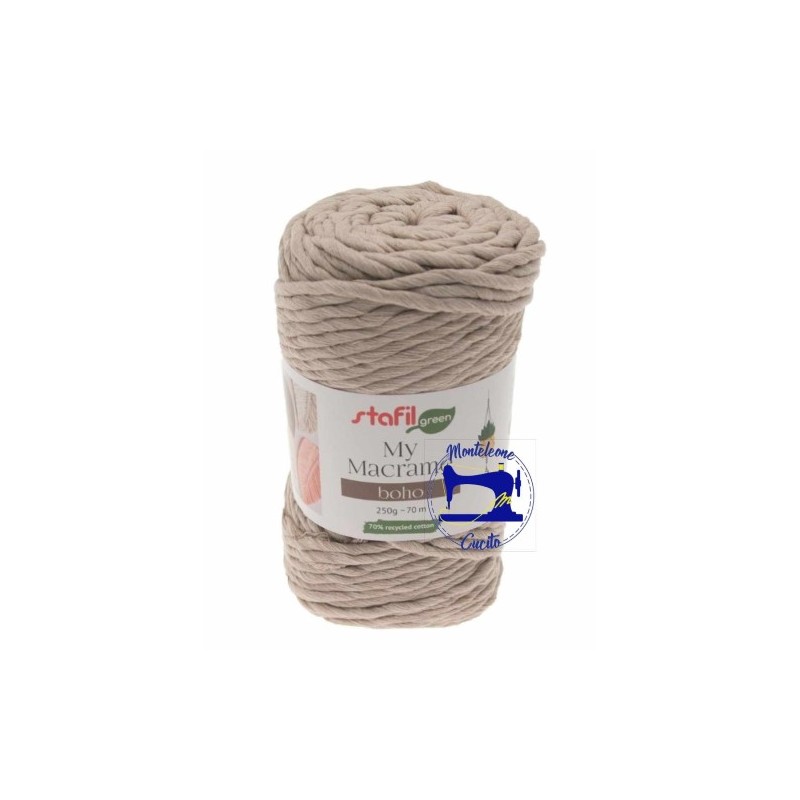 70% cotone riciclato 30% poliestere Il macramé è una tecnica di annodatura originaria dall’Oriente che sta diventando sempre più popolare anche da noi. In un batter d’occhio, si possono creare opere d’arte tessute come decorazioni murali, gioielli o altri oggetti. Trattandosi di materiale in gran parte riciclato è possibile riscontrare una leggera variazione di tonalità del colore da una fornitura all’altra.