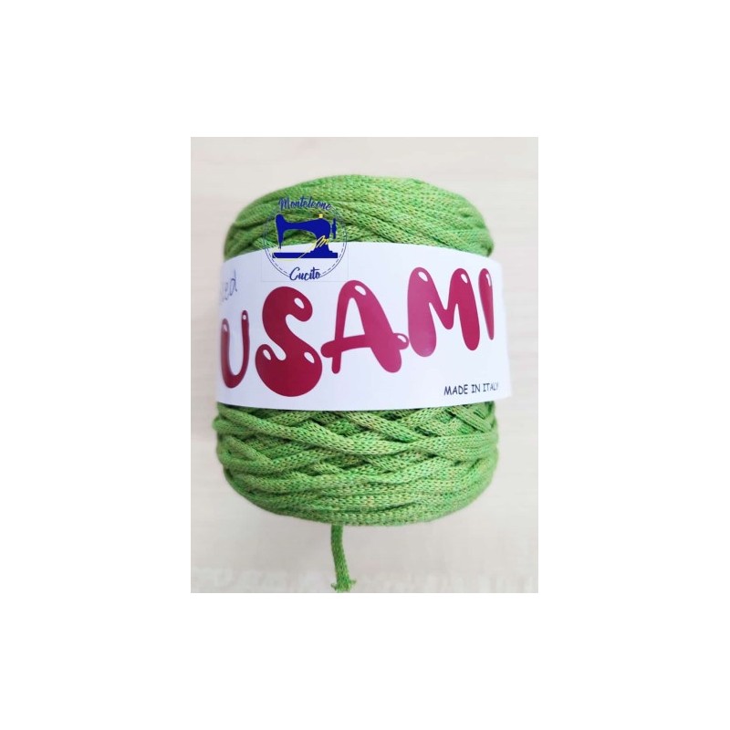 Il filato "Usami" da 100gr. di I nastri di Mirta è una piattina da 3 mm caratterizzata da una composizione equilibrata, composta al 50% da viscosa e al 50% da poliestere riciclato. Questo filato è prodotto interamente in Italia, riflettendo l'attenzione all'alta qualità e la consapevolezza ambientale nel processo di produzione.