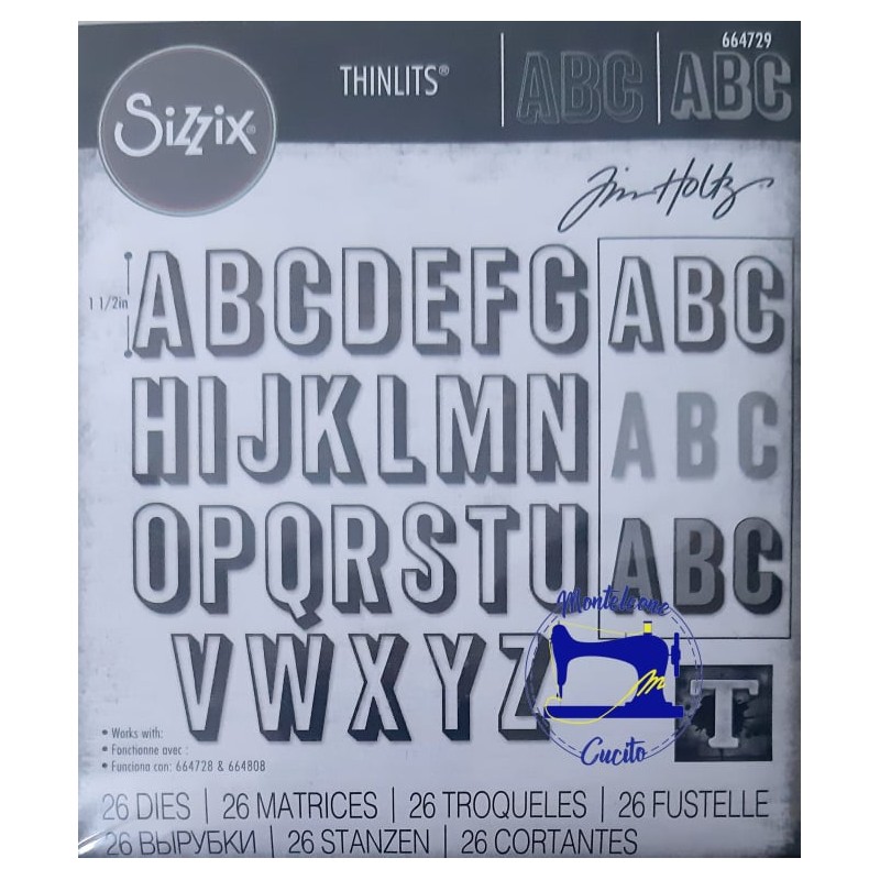 Questa fustella permette di ritagliare un alfabeto maiuscolo con caratteri ombreggiati.