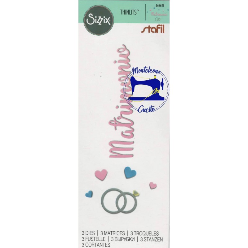 Tre fustelle per ritagliare una scritta matrimonio, due fedi nuziali e cuori