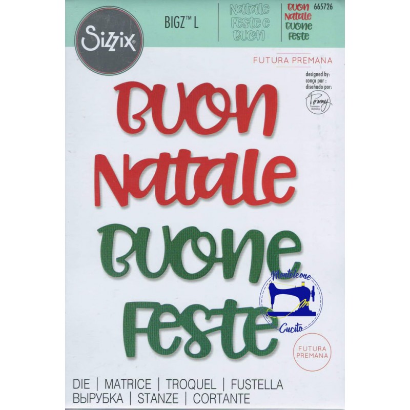 Questa fustella permette di ritagliare due scritte augurali "Buone Feste" e "Buon Natale" .