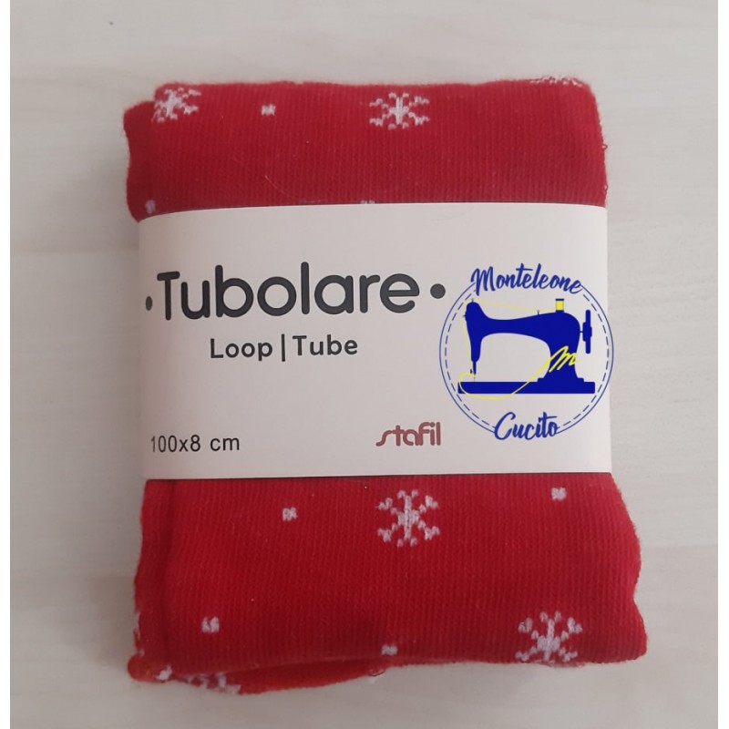 Tubolare rosso con fiocchi di neve bianco, utile per rivestire sfere di politirolo e nella pupazzeria. Può essere cuciro ed incollato.