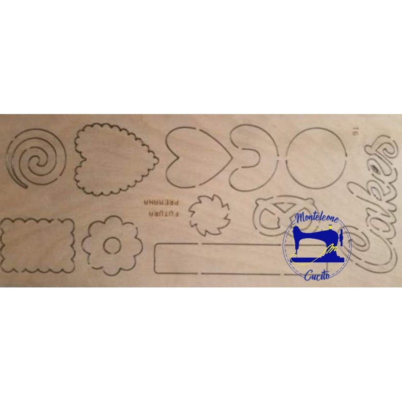 Questa fustella permette di ritagliare ben 10 biscotti differenti oltre alla scritta "CAKES", disegnata da Susi Scolari