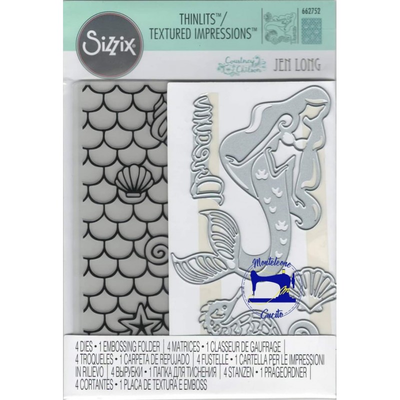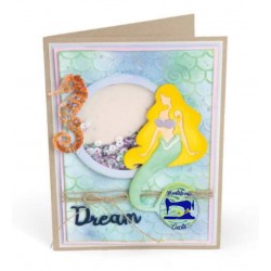 Quattro fustelline metalliche più cartella per goffratura per realizzare una sirenetta, un cavalluccio marino, una conchiglia e la scritta "Dream"