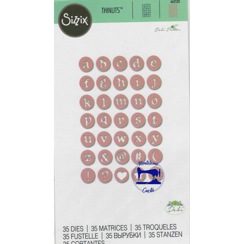 35 fustelline metalliche per ritagliare un alfabeto minuscolo stampatello, simboli e segni di punteggiatura all'interno di piccoli cerchi. Taglia materiali sottili, tra cui cartoncini, tessuti, moosgummi, carta, gomma crepla fino a 2mm.