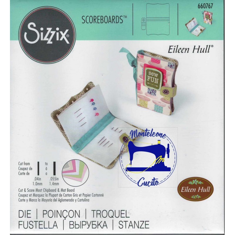 Questa fustella permette di realizzare un utilissimo libretto punta - aghi e punta spilli. Taglia nettamente materiali spessi, tra cui cartoncini, tessuti, moosgumi, pellicole metalliche, pelle, carta, cartoncino e feltro da 3mm. Dimensioni: cm 9.21 x 12.70 - cm 2.22 x 5.08