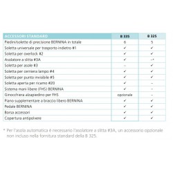 GAMMA DI ACCESSORI COMPLETA Con i pratici accessori, cucire risulta ancora più piacevole e facile. I modelli B 335 e B 325 dispongono di un corredo completa di piedini BERNINA standard che permette di raggiungere il risultato desiderato in modo semplice e veloce. Per riporre tutto in ordine, gli accessori sono custoditi in una piccola ed elegante borsetta. Il piano supplementare a braccio libero aumenta la superficie d'appoggio e lo spazio intorno all'ago. Inoltre, BERNINA Serie 3 è ampliabile con un vasto assortimento di accessori opzionali.